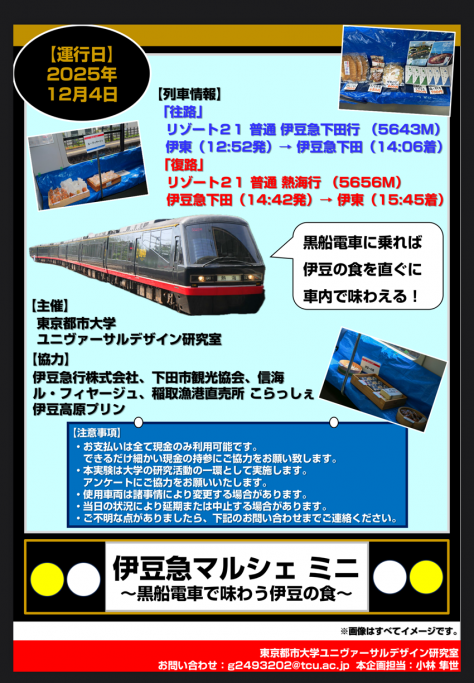東京都市大学都市生活学部 西山研究室は、伊豆急行線において2025年12月4日(木)に、伊豆急行株式会社協力のもと、鉄道車両を活用した実証実験「伊豆急マルシェ ミニ」を運行しました。